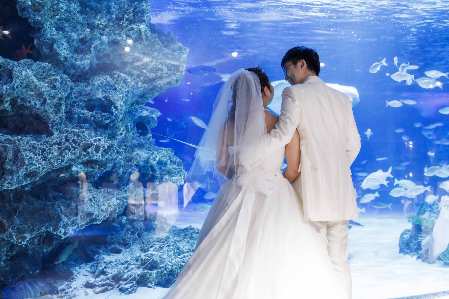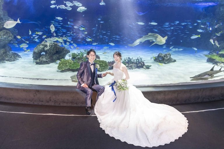 思い出のデートスポットで叶えた水族館ウェディングチョウチョウウオの群れとともに刻む、忘れられない瞬間2025/09/14K.K様 & M.K様ロケーションフォトヘアメイクフォトスポットウエディングドレスカラードレス